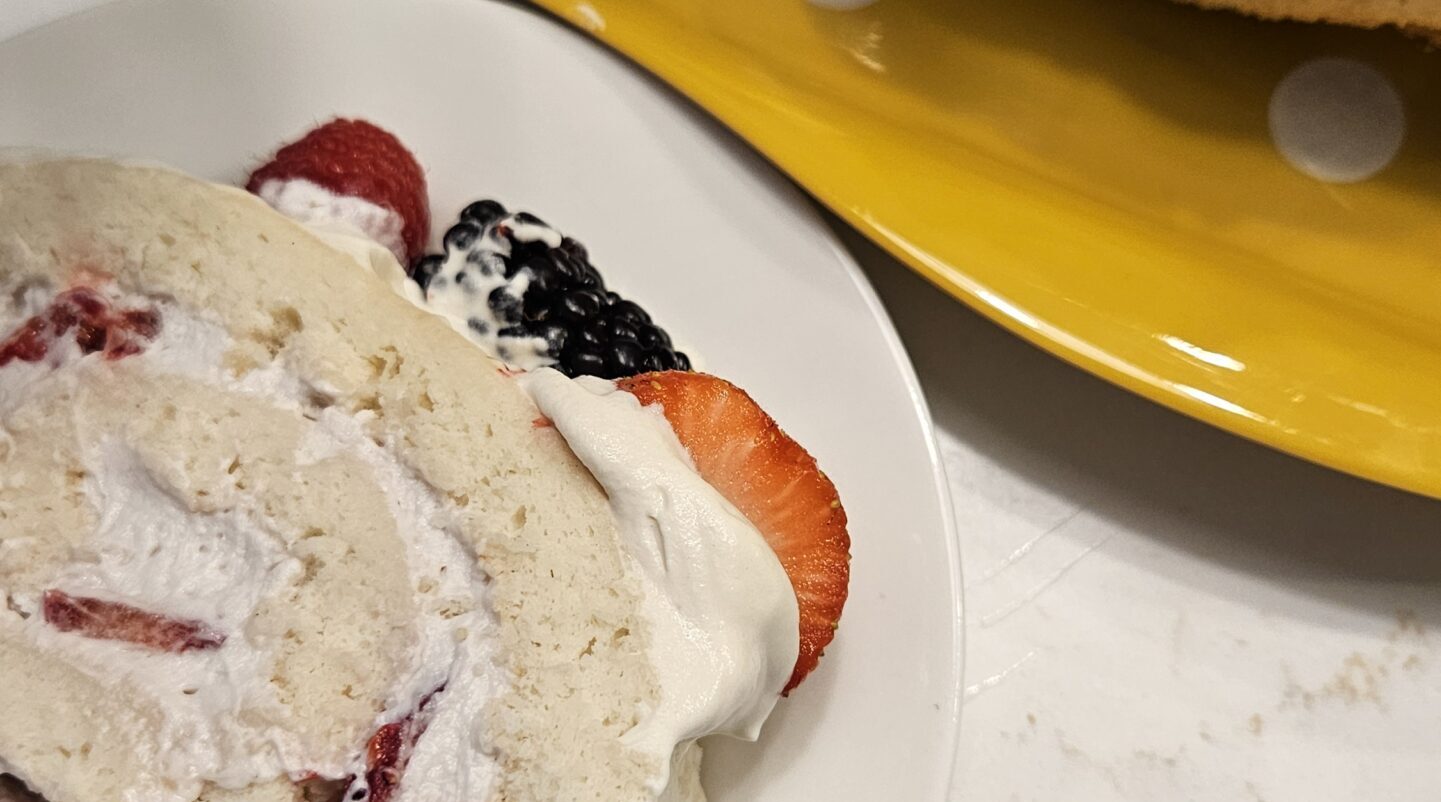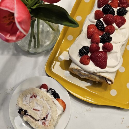 • When ready to serve, remove the plastic wrap and place the roll on a serving tray or cutting board. Top with remaining whipped cream and berries.